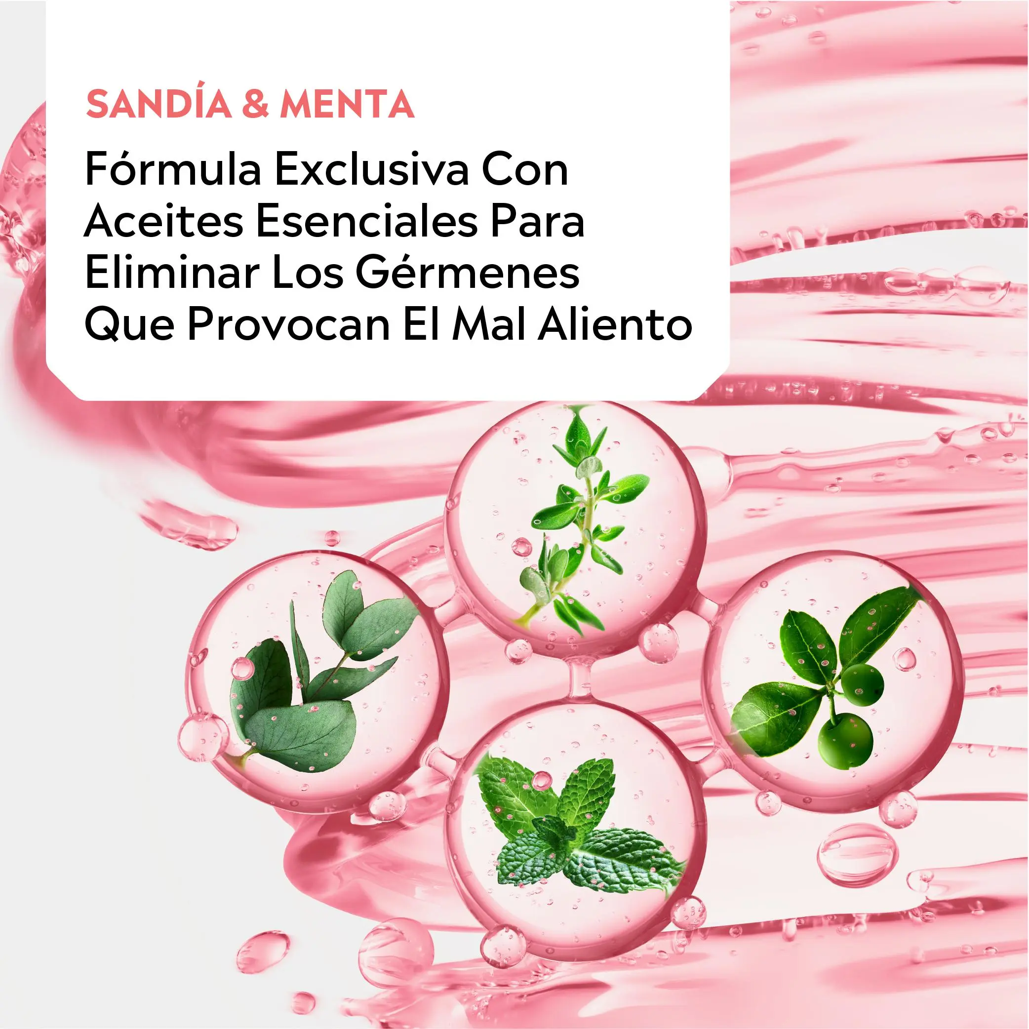 LISTERINE ® SANDIA & MENTA elimina hasta el 99.9% de los gérmenes que causan el mal aliento y la placa bacteriana. Brindando 24 horas de protección* para una higiene bucal completa.